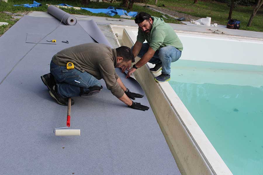 It is essential to carry out a thorough cleaning of the entire surface, as well as of the pool area. It is important to remember the reinforced PVC membrane will replicate the shape of any imperfection or impurity. For this reason, and given the decking area is usually large, it is recommended to use an industrial vacuum cleaner, to remove both solid and liquid waste. Several extensive cleans will be carried out after each stage prior to the membrane application.