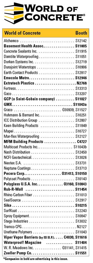 When the new year rolls around, so does the trade show schedule. Trade shows can be overwhelming, with thousands of attendees and hundreds of events spread out over a large area. To make the most of in-person events, it helps to have a plan. Download the event’s app ahead of time and check out the website. Scout out the booths that relate to your industry or interest ahead of time and make a list. Take note if any of them are offering demonstrations or product giveaways, and what times those take place. Here are lists of the booths that relate to the waterproofing industry for World of Concrete. Bolded exhibitor listings are advertisers in this issue of the magazine.